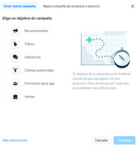- Selecciona el objetivo de tu campaña. Puedes elegir entre una variedad de objetivos, como tráfico web, conversiones, interacción, alcance, etc.